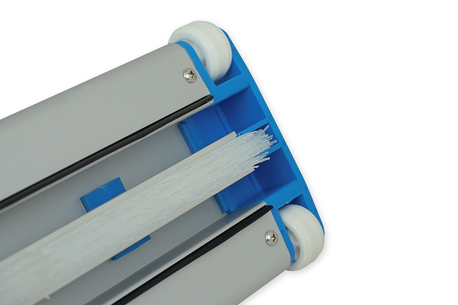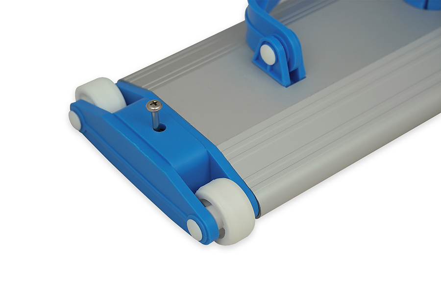 Made of aluminium, with brushes on the base and plastic wheels. For Ø38mm hose connection.
