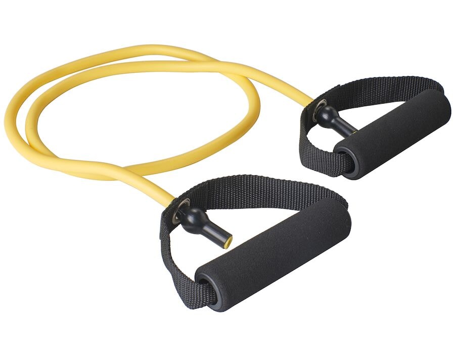 Æfingaband með handfangi fyrir styrk og endurhæfingu. Fáanlegt í mismunandi hörku og hægt að stilla það að vild.