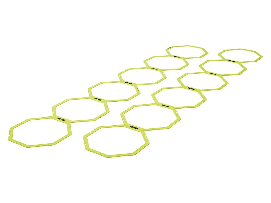 Þjálfið hraða og snerpu með þessum snjöllu snerpuhringjum. Hannaðir til að bæta hreyfimynstur þitt, sem getur síðar verið úrslitaþáttur í mikilvægum leikjum. Kemur í setti með 12 áttahyrndum hringjum og 11 plastklemmum, þannig að auðvelt er að tengja þá saman. Með klemmunum er hægt að smella hringjunum saman á marga mismunandi vegu og aðlaga uppsetninguna að einstökum æfingum. Þeir eru úr sterku plasti sem þolir mikinn þrýsting frá fótaáföllum. Björt liturinn gerir þá auðvelt að koma auga á á fótboltavellinum eða íþróttagólfi. Mælist 50/65 cm og hægt er að nota þá bæði úti og inni. Kemur í svörtum geymslutösku með burðaról og rennilás.