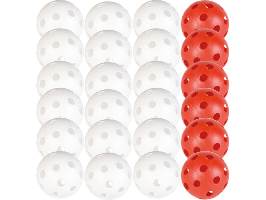 24 slidstærke floorball / Hockeybolde i hvid og rød.