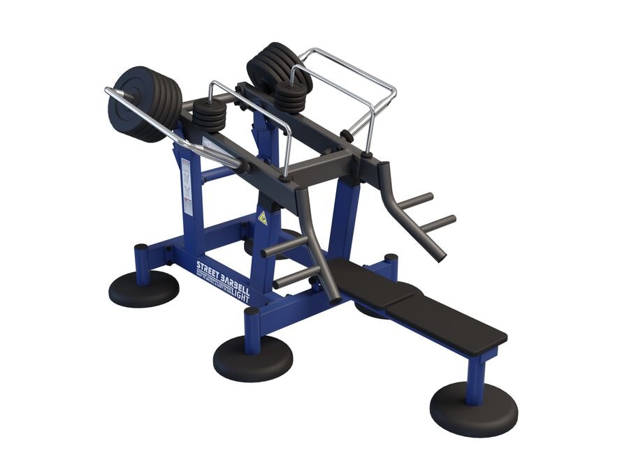 Bekkpressa er klassísk æfing. Hún virkjar og vinnur með nokkrum vöðvahópum í og í kringum efri hluta líkamans. Þetta þjálfar bæði axlir, bringu, handleggi og úlnliði. Með lokuðu lóðakerfi er hægt að stilla viðnámið frá 10 kg upp í 230 kg. Lóðarplöturnar eru 10 x 20 kg og 8 x 2,5 kg. Street Barbell Light æfingastöðvarnar þurfa ekki festingar og hægt er að setja þær hvar sem er á sléttu yfirborði. Einkaleyfisvarið lóðakerfi sem er skemmdarvarið og þjófnaðarvarið. Hágæða og örugg þjálfun fyrir alla. Veldu á milli staðlaðra lita blás, græns og gulur.