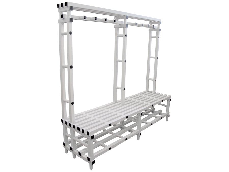 Einn fataskápsbekkur með töskuhillu, skóhillu og fatahengi. Nóg pláss fyrir skó, jakka, töskur og þess háttar. Skiptibekkurinn er úr sterku og afar endingargóðu PVC-efni, sem auk þess að vera bakteríu- og klórþolið er einnig auðvelt að halda snyrtilegu og hreinu. Vinsæl lausn fyrir búningsklefa í sundlaugum. Ferkantaðar rimlar og uppbygging bekkjarins gera hann mjög stöðugan með mikla burðarþol. Bekkurinn er fáanlegur í nokkrum lengdum og er einnig í boði með öðrum lausnum.