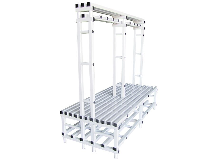 Tvíhliða fataskápsbekkur með töskuhillu, fatahengi og skóhillu. Gott pláss fyrir skó, jakka, töskur og þess háttar. Skiptibekkurinn er úr sterku og afar endingargóðu PVC-efni, sem auk þess að vera bakteríu- og klórþolið er einnig auðvelt að halda snyrtilegu og hreinu. Vinsæl lausn fyrir búningsklefa í sundlaugum. Ferkantaðar rimlar og uppbygging bekkjarins gera hann mjög stöðugan með mikla burðarþol. Bekkurinn er fáanlegur í nokkrum lengdum og er einnig í boði með öðrum lausnum.