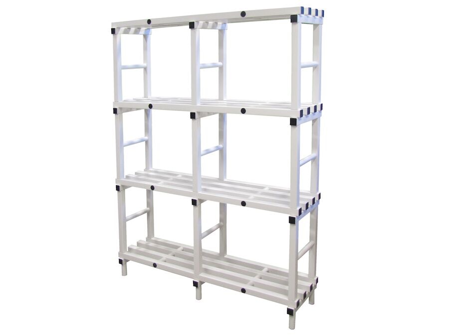 Hillur úr gegnheilu PVC fyrir blautrými. Hin fullkomna geymslulausn fyrir sundlaugina. Ónæmar fyrir bakteríum, raka og klór. Ferkantaðar rimlar gera hillurnar stöðugar með mikilli burðargetu.