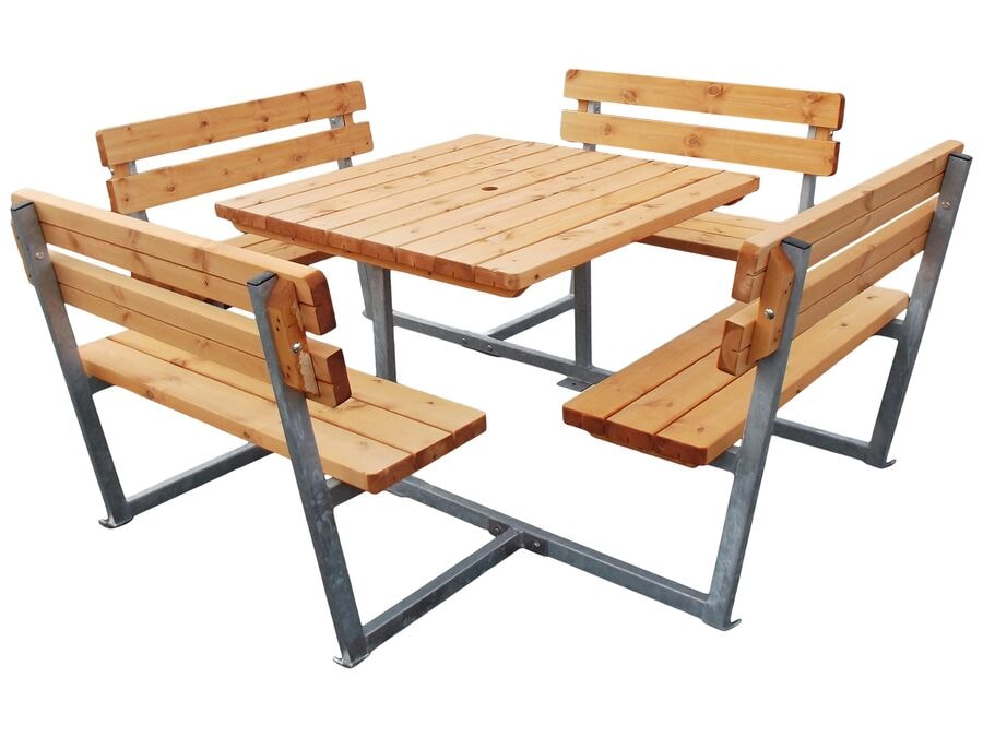 Fjögurra hliða borð-/bekkjasett með heitgalvaniseruðum grind. Borð og bekkir úr lofttæmdu furuviði. Borðhæð: 75 cm. Bekkhæð: 47 cm. Afhent ósamsett. Lengd: 236 cm. Breidd: 236 cm.