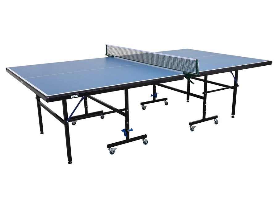 Samanbrjótanlegt borðtennisborð til notkunar innanhúss með 15 mm toppplötu, hjólum og öryggislás. Auðvelt að geyma, flytja og undirbúa fyrir leik. Borðtennisnet fylgir. HIVE borðtennisborðið er hagnýtt og notendavænt borð til notkunar innanhúss. Það er búið 15 mm MDF leikfleti, sem veitir mjúka og stöðuga boltaviðbrögð. Ramminn er úr stáli með traustum ramma sem veitir góða stöðugleika við leik. Borðið er búið 8 hjólum, þar af 4 með bremsu, þannig að það er auðvelt að færa það og stendur jafnframt stöðugt við notkun. Öryggislás tryggir að borðið sé auðvelt að brjóta upp og öruggt að geyma þegar það er samanbrotið. Hægt er að nota spilunaraðgerðina, þar sem annar helmingurinn er lyftur upp fyrir einstaklingsþjálfun og leik. HIVE borðtennisborðið er afhent ósamsett, þar með talið borðtennisnet.