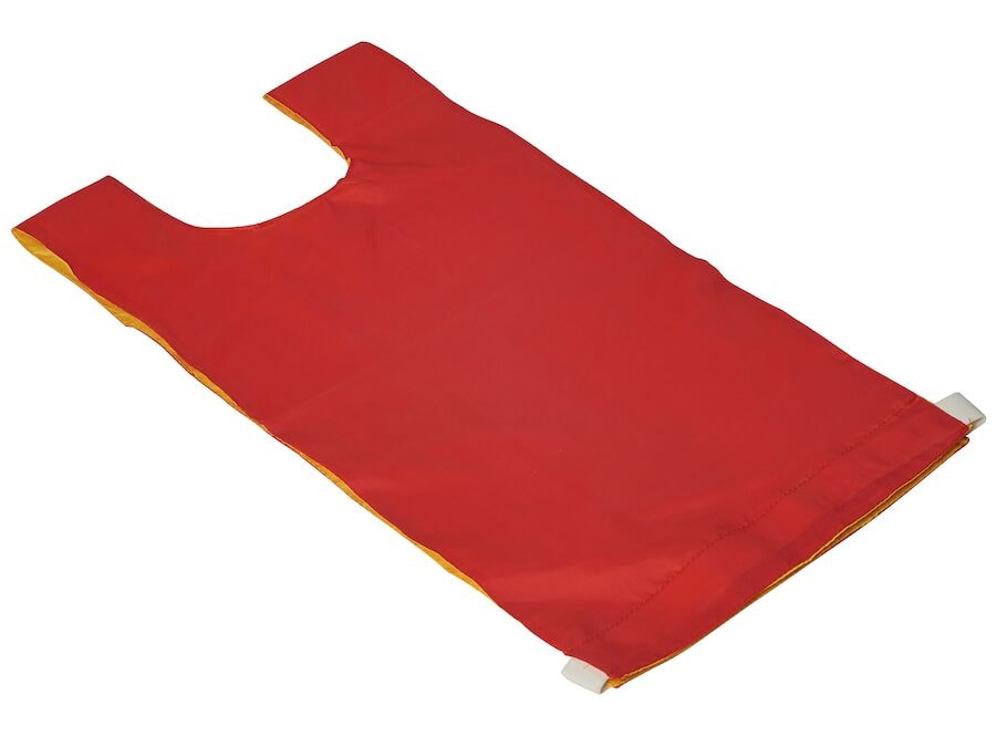 Vesti úr léttu nyloni sem hægt er að snúa við, rautt öðru megin og gult hinu megin. Vestið er 56,5 cm langt og 31 cm breitt. Passar flestum börnum á aldrinum 3 til 8 ára.