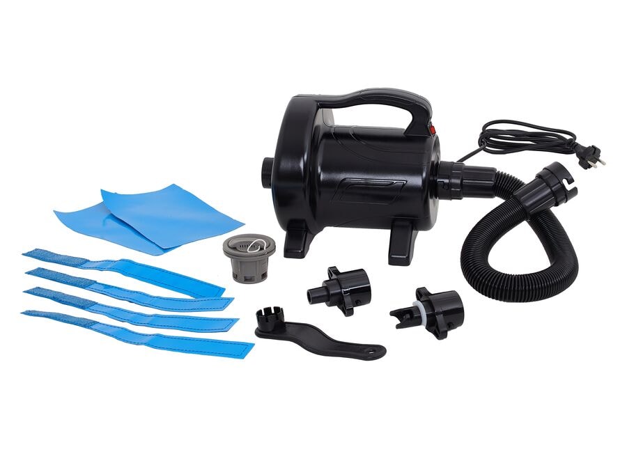Aukadæla og viðgerðarsett fyrir uppblásna fótboltavelli og knattspyrnuvelli. Auk rafrænnar dælu fylgja aukaloki, lokalykill, tenginippelar og plástrar. Dæluna má einnig nota fyrir aðra uppblásna hluti eins og AirTracks. Getur bæði blásið upp og tæmt loftið. Þessi aukadæla og viðgerðarsett er ætlað fyrir uppblásna fótboltavelli og knattspyrnuvelli. Settið inniheldur öfluga dælu (gerð ZJ106, 1200 W), CE og RoHS vottaða, sem tryggir hraða og skilvirka uppblástur (inntak: AC 220–240 V, tíðni: 50–60 Hz). Dælan getur bæði blásið upp hluti og tæmt þá aftur, sem er sérstaklega hentugt þegar pakka þarf niður og geyma brautirnar eða aðra stóra hluti. Þökk sé meðfylgjandi tengingum er einnig hægt að nota settið fyrir aðra stærri uppblásna hluti, eins og AirTracks. Tæknilegar upplýsingar: • Afl: 1200 W • Loftflæði: u.þ.b. 3500 L/mín • Vinnuþrýstingur: u.þ.b. 4,6 psi • Afl: AC 220–240 V, 50–60 Hz Settið inniheldur: • Rafmagnsdælu • Loka •