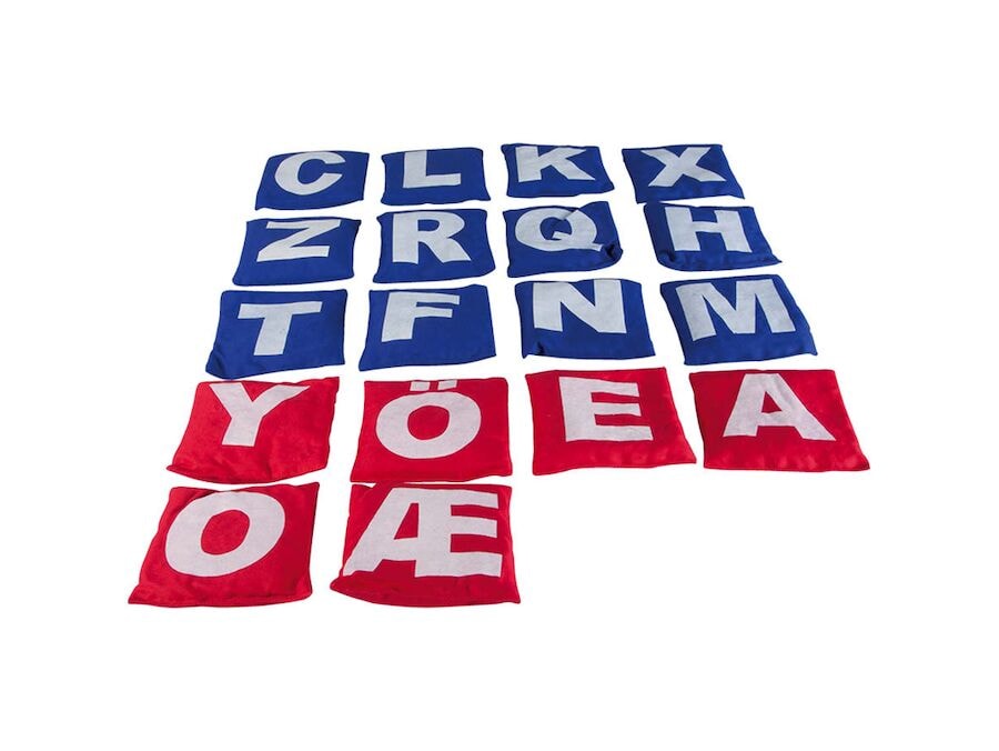 Erpokar með bókstöfum geta hjálpað til við að koma náminu af stað. Þetta sett samanstendur af alls 18 ertapokum með bókstöfum á báðum hliðum, þar sem allt danska stafrófið og aðeins fleira er innifalið. 12 bláu erpokarnir eru með samhljóðum og þeir 6 rauðu með sérhljóðum.