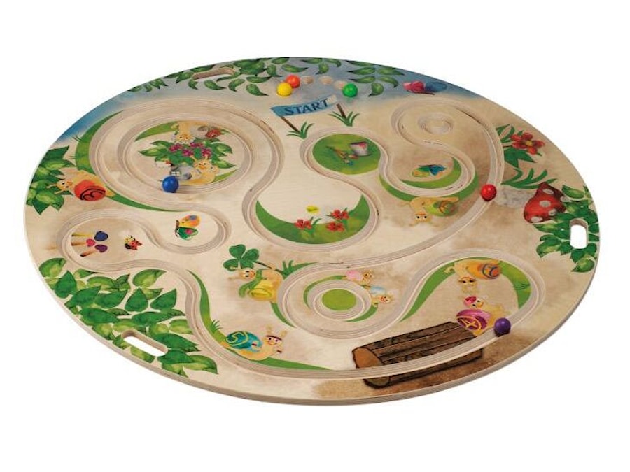 Erzi jafnvægisbretti með kringlóttri kúlubraut er krefjandi og skemmtileg leið til að bæta jafnvægi og samhæfingu. Jafnvægisbrettið er prentað með skemmtilegri sniglakeppni og sex lituðu kúlurnar passa við sex sniglana á brettinu. Jafnvægisbrettið er tilvalið fyrir bæði einstaklings- og hópaleik. Jafnvægisbrettið er með innbyggða skál undir brettinu sem kemur í veg fyrir að það skilji eftir sig merki á gólfinu. Einnig eru þrjú innbyggð handföng sem gera það auðvelt að bera jafnvægisbrettið þegar það er ekki í notkun.