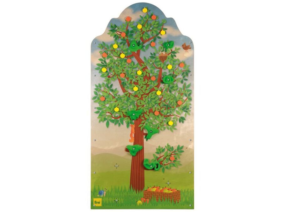 Erzi klifurveggur, eplatré: Skemmtileg og krefjandi leið til að efla hreyfifærni, liðleika og samhæfingu barna. Erzi klifurveggur, eplatré, er fallegur og aðlaðandi klifurveggur sem hentar fullkomlega fyrir leikskóla og dagskóla. Börnin geta klifrað upp klifurvegginn og reynt að safna öllum Velcro eplum, blómum eða rósum. Fullorðinn sem hefur umsjón með æfingunni getur ákveðið hvaða grip má nota hvert á eftir öðru, eða hvaða Velcro epli, blóm eða rósir á að safna fyrst. Þannig er hreyfifærni, liðleiki og samhæfing þjálfað á leikrænan hátt. Klifurveggurinn er festur á lausan vegg með meðfylgjandi festingarfestingum. Síðan eru 7 gripin sett í mismunandi gripgöt. Hægt er að setja gripin í mismunandi gripgöt öðru hvoru til að breyta klifurleiðinni. Gripin eru „snúningsfest“ og gefa börnum gott grip. Þegar öll gripin eru komin í klifurvegginn er hægt að setja eplin, blómin eða rósirnar með frönskum rennilás á