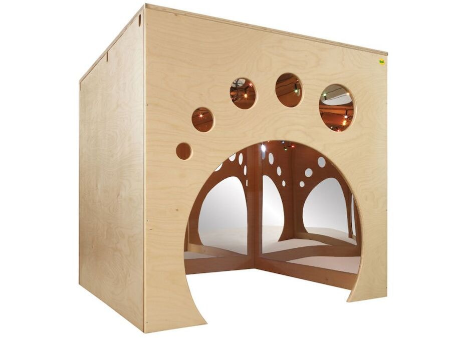 Erzi leikteningurinn er einstakur tréhellir fullur af speglum. Speglarnir endurkasta öllu ljósi, hreyfingum og miklu meira og skapa heillandi og töfrandi heim fyrir börn, ungmenni og fólk með sérþarfir. Með leikteningnum í laginu eins og trékubb með speglum geta börn uppgötvað sína eigin sjálfsmynd og aukið skynjun sína á skemmtilegan og gleðilegan hátt. Teninginn má einnig nota sem kyrrlátt athvarf fyrir börn í leikskóla eða svipuðu umhverfi. Bættu við kodda og ljósum og gerðu það enn notalegra fyrir börnin (Koddar og ljós fylgja ekki með).