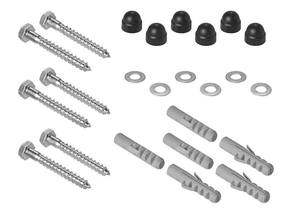 Festingarhlutir fyrir 3 veggstoðir. Inniheldur: 6 x franskar skrúfur 10×80 FZB, 6 x þvottavélar DIN 1440, 6 x 12×60 nylon tappa og 6 x hettur fyrir sexhyrnda bolta.