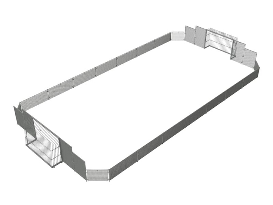 Allir stálhlutar eru heitgalvaniseraðir fyrir bestu ryðvörn. Brautareiningarnar eru úr stálgrind. Efri rör sem frágangur á endum og löngum hliðum, hallandi hornbrautir. Ein hliðareining á fjölvellinum er gerð sem þjónustuhlið. Heilsuðu mörkin eru undirbúin fyrir eftirbyggingu á körfuboltaeiningu. Festingarskrúfur og boltar eru úr ryðfríu stáli eða Delta-Magnum-meðhöndluðu. Brautin er 1 m há. samkvæmt. Prófað samkvæmt DS/EN 15312/A1:2010. Sjá einnig sérstakan bækling okkar “Virk íþróttavöllur” á vefsíðu okkar undir rafrænum vörulistum.