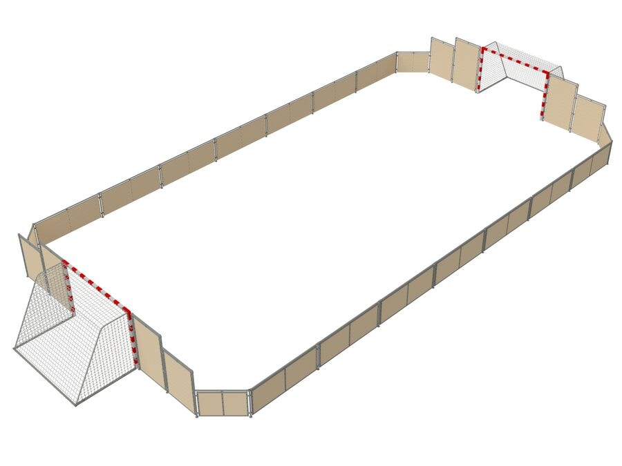 Allir stálhlutar eru heitgalvaniseraðir fyrir bestu ryðvörn. Vallareiningarnar eru með innfelldum 1. flokks sléttuðum lerkiplankum. Efri rör sem frágangur á endum og langhliðum, hallandi hornborð. Önnur hliðareiningin er gerð sem þjónustuhurð. Festingarskrúfur og boltar eru úr ryðfríu stáli eða Delta-Magnum meðhöndlað. Vallarhæð 1 metri samkvæmt staðli: Prófað samkvæmt DS/EN 15312/A1:2010 Fjölvallaríþróttavöllur Fjölvallarvöllur