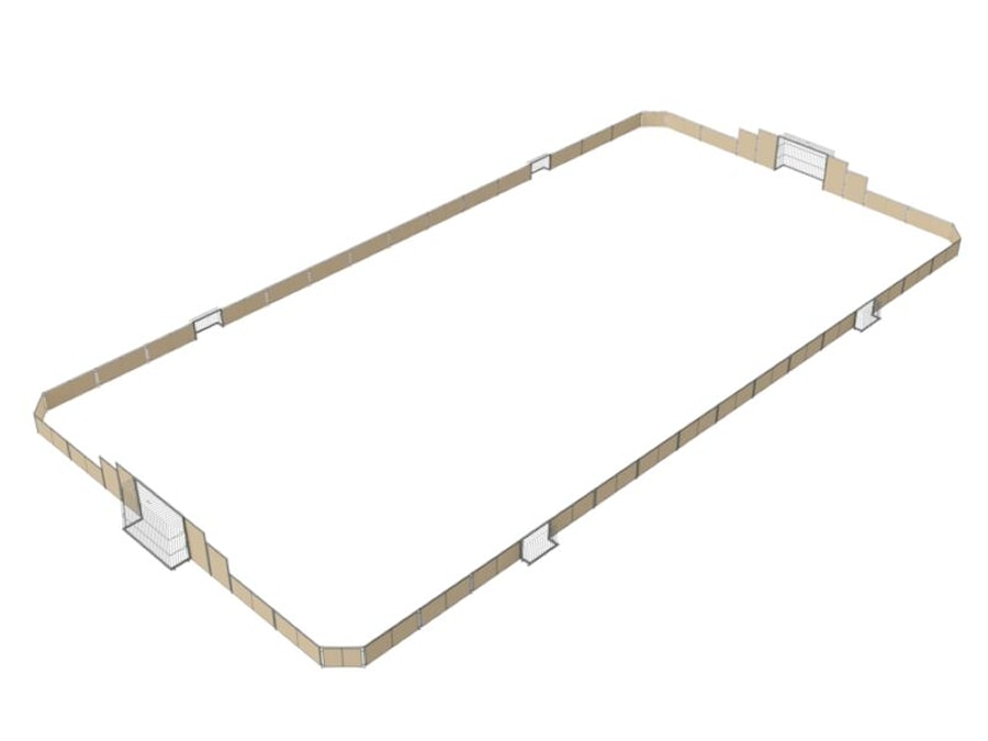 Allir stálhlutar eru heitgalvaniseraðir fyrir bestu ryðvörn. Markvíðurnar eru með innfelldum 1. flokks söfluðum lerkiviðarplönkum. Efri rör sem frágangur á endum og löngum hliðum, hallandi hornrönd. Önnur hliðareiningin er gerð sem þjónustuhurð. Heilsuðu mörkin eru undirbúin fyrir uppsetningu á körfuboltaeiningu. Festingarskrúfur og boltar eru úr ryðfríu stáli eða Delta-Magnum-meðhöndluðu. Beltahæð 1 m samkvæmt staðli: Prófað samkvæmt DS/EN 15312/A1:2010