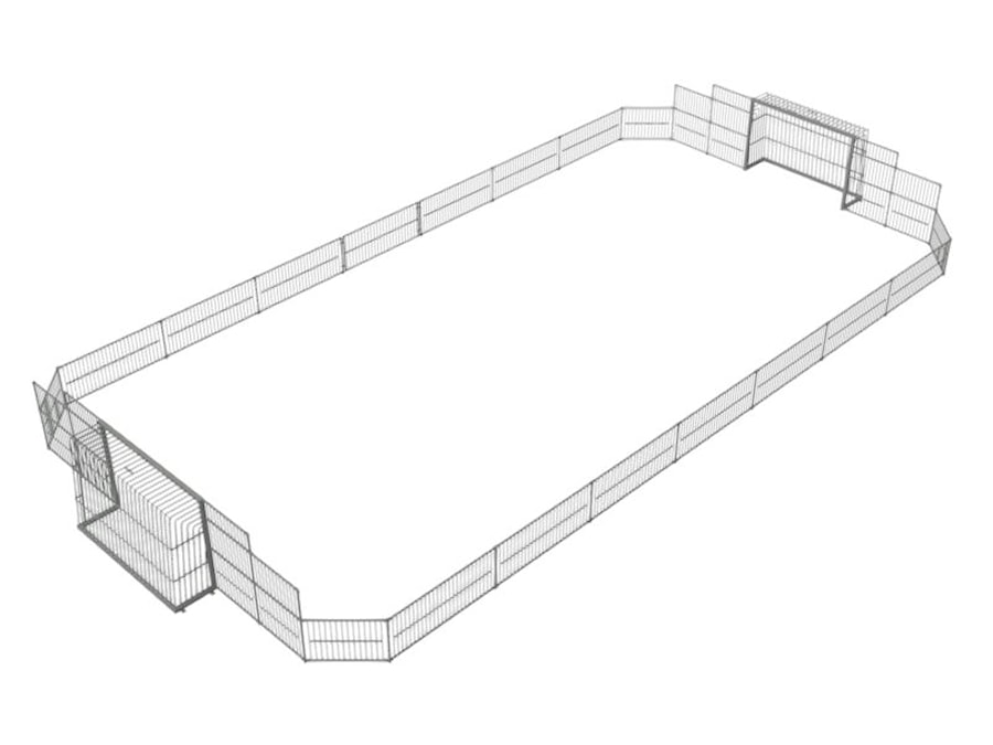 Allir stálhlutar eru heitgalvaniseraðir fyrir bestu ryðvörn. Þverslá. Bönd úr heitgalvaniseruðu stáli. Efri rör sem frágangur á endum og löngum hliðum, hallandi hornbönd. Önnur hliðareiningin er gerð sem þjónustuhurð. Heilsuðu mörkin eru undirbúin fyrir uppsetningu á körfuboltaeiningu. Festingarskrúfur og boltar eru úr ryðfríu stáli eða Delta-Magnum-meðhöndluðu. Böndhæð 1 metri samkvæmt staðli: DS/EN 15312/A1:2010 Fjölvallaríþróttavöllur Fjölvallarvöllur