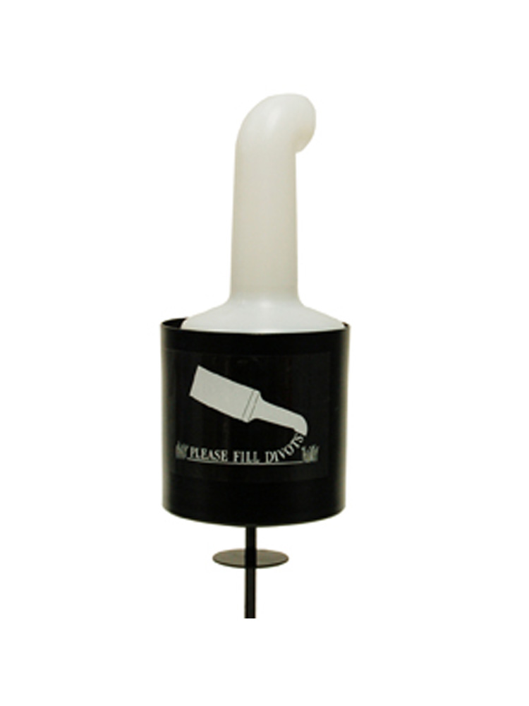 Flaska sem geymir áburð og heldur honum þurrum ásamt standi sem er úr stáli.