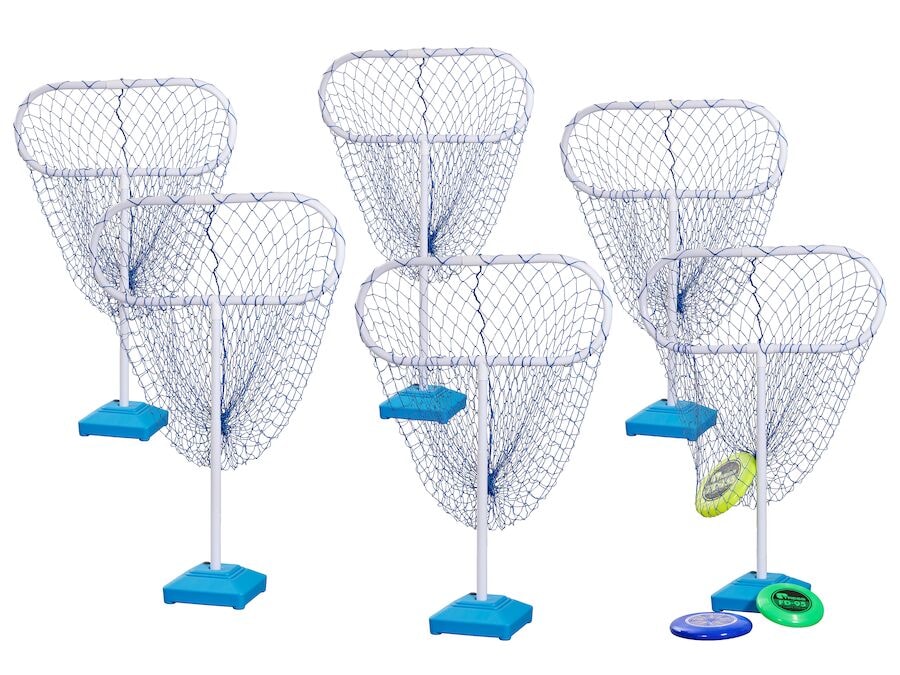 Frisbígolfsett með 6 diskagolfkörfum og 3 mismunandi frisbíkúlum.