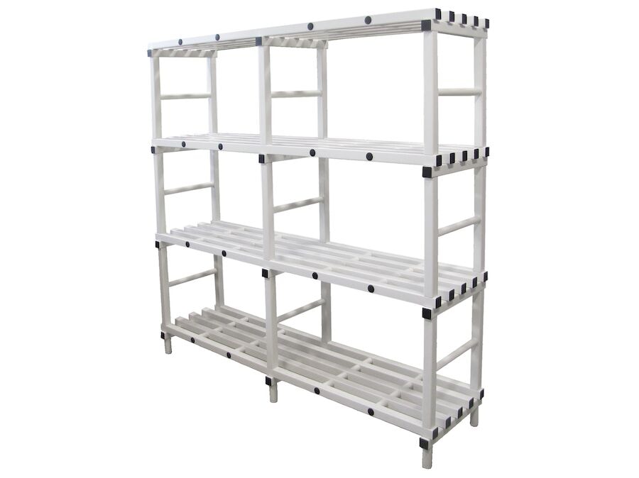 Hillur úr gegnheilu PVC fyrir blautrými. Hin fullkomna geymslulausn fyrir sundlaugina. Ónæmar fyrir bakteríum, raka og klór. Ferkantaðar rimlar gera hillurnar stöðugar með mikilli burðargetu.
