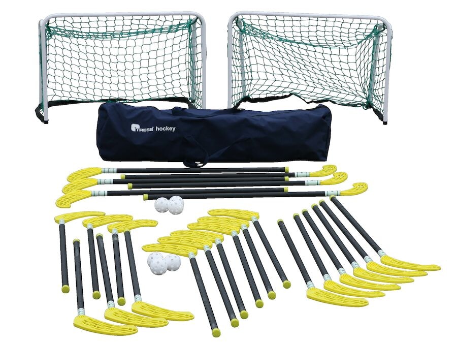 Heill innerboltasett fyrir skólanotkun með 24 kylfum, 12 boltum og 2 samanbrjótanlegum mörkum. Inniheldur 18 kylfur fyrir vinstri og 6 kylfur fyrir hægri. Kemur með stórri geymslutösku. Tilvalið innerboltasett fyrir kennslu og sameiginlegar æfingar. Settið inniheldur samtals 24 innerboltakylfur, skipt í 18 kylfur fyrir vinstri og 6 kylfur fyrir hægri. Inniheldur 12 klassíska hvíta innerboltakúlur og 2 samanbrjótanleg mörk í stærðinni 90 x 60 cm. Kylfum og boltum er auðvelt að geyma og flytja í rúmgóðri innerboltatösku sem fylgir með og rúmar allt að 24 kylfur. Settið hentar til notkunar innanhúss og markvissrar æfinga með mörgum þátttakendum. Innihald: • 24 innerboltakylfur (18 vinstri, 6 hægri) • 12 hvítir boltar • 2 samanbrjótanleg mörk (90 x 60 cm) • 1 stór innerboltataska