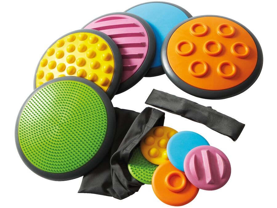 Aðlaðandi snertiefni sem skorar á snertiskyn barna bæði á höndum og fótum. Snertiskífurnar eru úr tilbúnu gúmmíi, sem er þægilegt viðkomu, og hafa mismunandi uppbyggingu í hverjum lit. Hver þessara uppbygginga er að finna á stórum diski sem hægt er að setja á gólfið, sem og litlum diski sem barnið getur haldið í hendinni. Diskarnir bjóða upp á fjölmarga leikmöguleika, allt frá mjög grunnupplifun af uppbyggingunum til leikja þar sem börnin eru með bundið fyrir augun og verða að æfa sig í að muna og þekkja. Leikina er hægt að aðlaga að aldri og virkni barnsins.