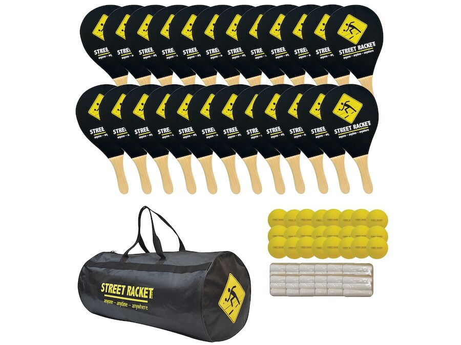 Götuspaðar: Spenna og skemmtun fyrir alla í skólagarðinum! Götuspaðar er kraftmikill og spennandi leikur sem er fullkominn til að koma skólagarðinum af stað og virkja nemendur á öllum aldri. Það er hægt að spila það á alls kyns undirlagi, bæði úti og inni, og krefst lágmarks búnaðar. Einföld og fljótleg uppsetning, endalaus skemmtun: Með Götuspaðar skólasetti er auðvelt og fljótlegt að byrja. Settið inniheldur allt sem þú þarft: Spaðar, bolta, krít og hagnýtan poka til geymslu og flutnings. Teiknaðu völlinn á malbikið, flísar eða merktu völl á grasinu eða í ganginum, og þú ert tilbúinn til að spila! Leikurinn fyrir alla: Götuspaðar er fjölbreyttur leikur sem hægt er að aðlaga að öllum stigum. Hvort sem þú ert vanur spaðahákarl eða byrjandi, geturðu tekið þátt í skemmtilegri og krefjandi baráttu. Einfaldar reglur leiksins gera það auðvelt að læra fyrir bæði börn og fullorðna, og mismunandi leikjaafbrigði skapa fjölbreytni og spennu. Meira en bara leikur: Street Racket er