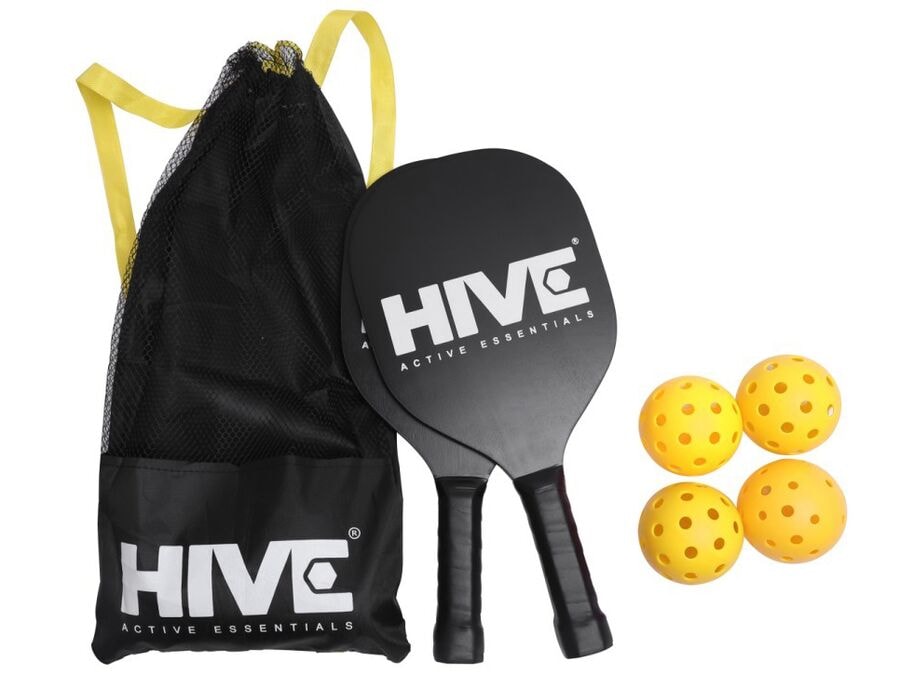 Hive Pickleball sett sem samanstendur af 2 kylfum (spaðum), 4 Pickleball boltum og 1 geymslupoka. Virkilega gott alhliða byrjendasett fyrir þá sem vilja prófa sig áfram í Pickleball. Hive Pickleball settið hentar skólum, félögum og íþróttafélögum sem vilja bjóða upp á nýja og spennandi íþróttastarfsemi. Settið inniheldur tvær spaðar og fjórar boltar, sem er nánast allt sem þú þarft til að byrja að spila Pickleball. Þessar spaðar frá Hive eru úr tré og eru hannaðar með mjúkum og vinnuvistfræðilegum handföngum fyrir þægilegt og fast grip. Boltarnir eru úr endingargóðu plasti og geymslupokinn er búinn snúrulokun, ólum og möskvaneti.