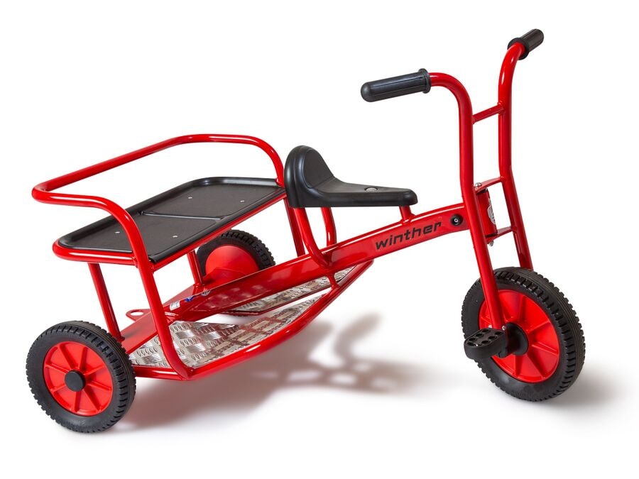 Stofnunarhjól með mörgum hvetjandi leikmöguleikum. Leigubílahjólið með tvöföldum aftursætum, sem rúmar tvö börn hvert við annað. Botnplata úr áli og eins og venjulega með dráttarstöng sem passar á mismunandi festingar. Winther hjól, dönsk hönnun.