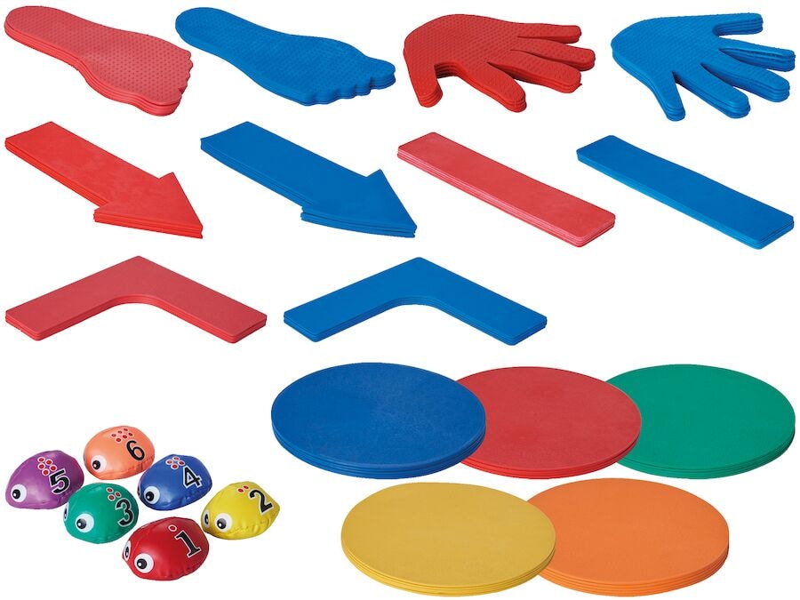 Hreyfifærnisett með samtals 83 hlutum, þar á meðal 6 baunasekkjum með tölum. Fjölmörg hlutar bjóða upp á ótal æfingar og leikmöguleika, þar sem áherslan er á hreyfifærni og jafnvægi. Allir hreyfifærnihlutar (nema baunasekkirnir) eru úr endingargóðu og rennandi gúmmíi sem auðvelt er að þrífa. Settið inniheldur: 25 diska í 5 litum, 10 línur í 2 litum, 8 horn í 2 litum, 12 handaför í 2 litum, 12 fótspor í 2 litum, 10 örvar í 2 litum og 6 baunasekkjum með tölum.