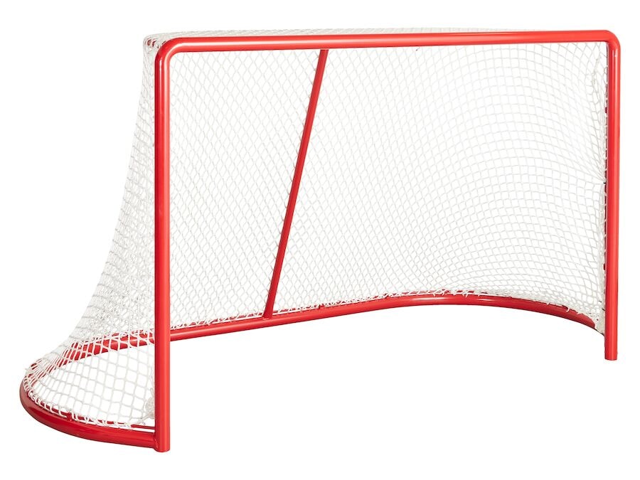 Íshokkímark fyrir keppni. Opinber stærð með 112 cm dýpt að neðan. Markið er úr heitgalvaniseruðu stáli með höggþolnu duftlakki í rauðu. Tilbúið fyrir festingu með sveigjanlegum pinnum. Bólstrun, sveigjanlegir pinnar og net fyrir íshokkímarkið, pantað sérstaklega.