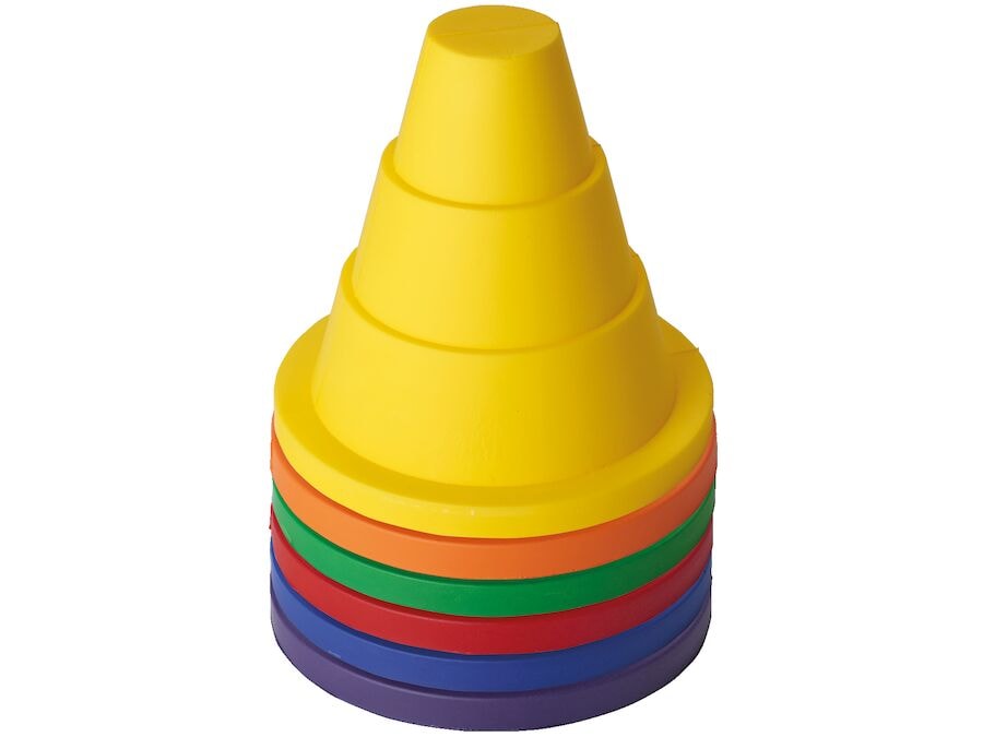 Sett með 6 mjúkum keilum í ýmsum litum. Þessar keilur brotna ekki ef þú lendir á þeim og eru algjörlega skaðlausar. Notaðar fyrir akreinamerkingar, leik, íþróttir og hreyfiþjálfun. Keilurnar eru um það bil 16 cm háar og hægt er að stafla þeim.