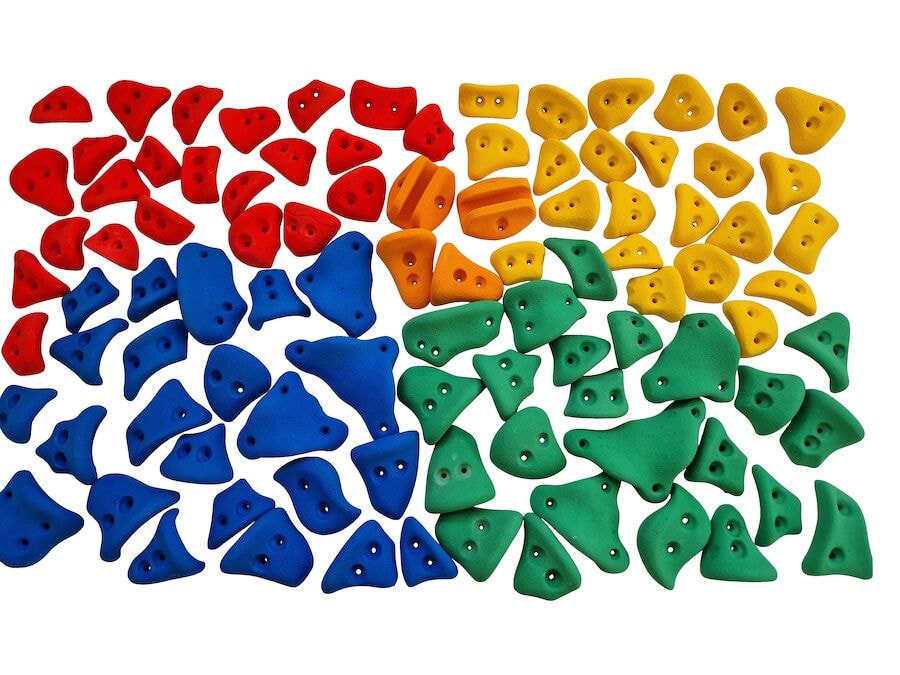 Stór pakki með 46 eða 92 klifurgripum í mismunandi litum, hönnun og erfiðleikastigum. Mismunandi form bjóða upp á marga möguleika á notkun og hægt er að festa þau á nánast öll slétt yfirborð. Erfiðleikastig: Auðvelt * – Miðlungs *** • Góð grip fyrir hendur barna og fullorðinna • Hægt að nota bæði innandyra og utandyra • Kemur í ýmsum litum • Uppfyllir EN1176 staðalinn og er framleitt samkvæmt EN12572 • Prófað samkvæmt REACH (Inniheldur engin hættuleg efni) Klifurgripin eru fest með venjulegum viðarskrúfum. (Ekki innifalið)