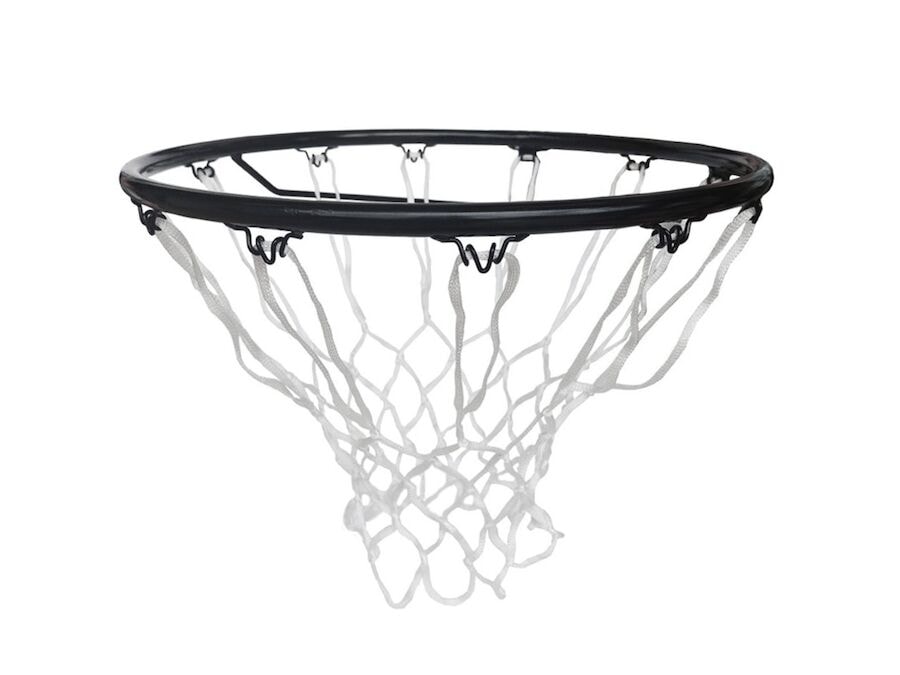 Svartlakkaður körfuboltakjarni í opinberri stærð með neti. Körfan er eingöngu notuð til skotæfinga og leiks, hún er ekki notuð til dæmis til að æfa skothríð.