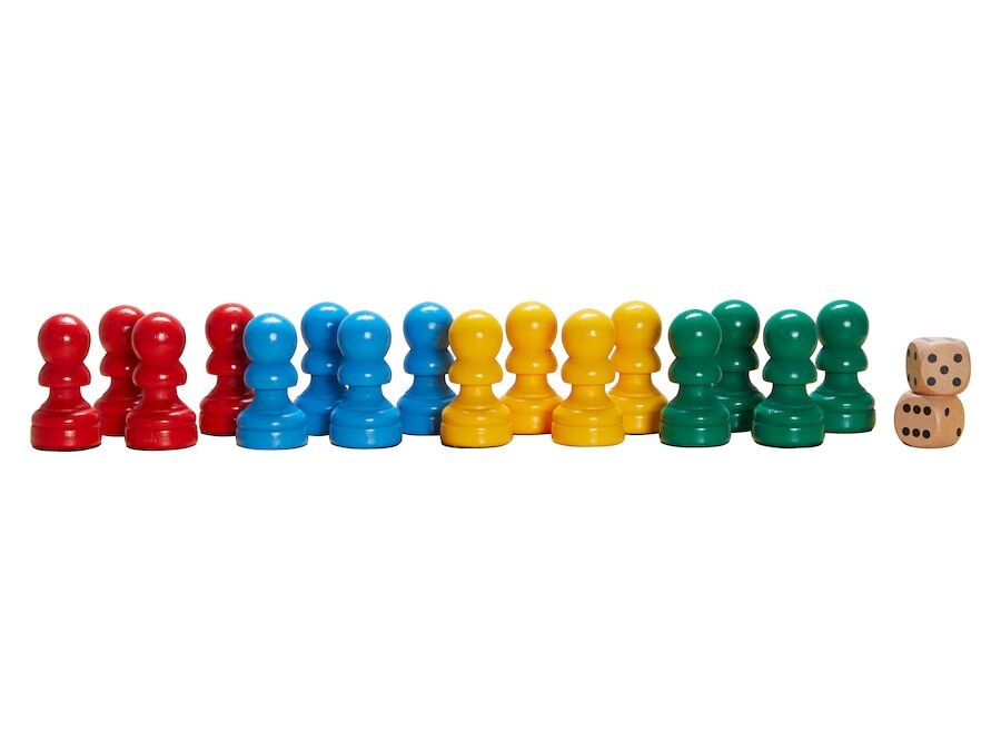 Sett af lausum lúdó-speglunum og teningum fyrir lúdó-leiki. Speglunin eru 4 cm í þvermál og 7,5 cm á hæð. Filt er undir botninum svo að þeir renni auðveldlega yfir spilaborðið. Það eru samtals 16 speglunar í 4 mismunandi litum og 2 teningar fylgja með. Speglunin henta fyrir skák, damm og lúdó-borð, en má einnig nota fyrir önnur lúdó-spilaborð.