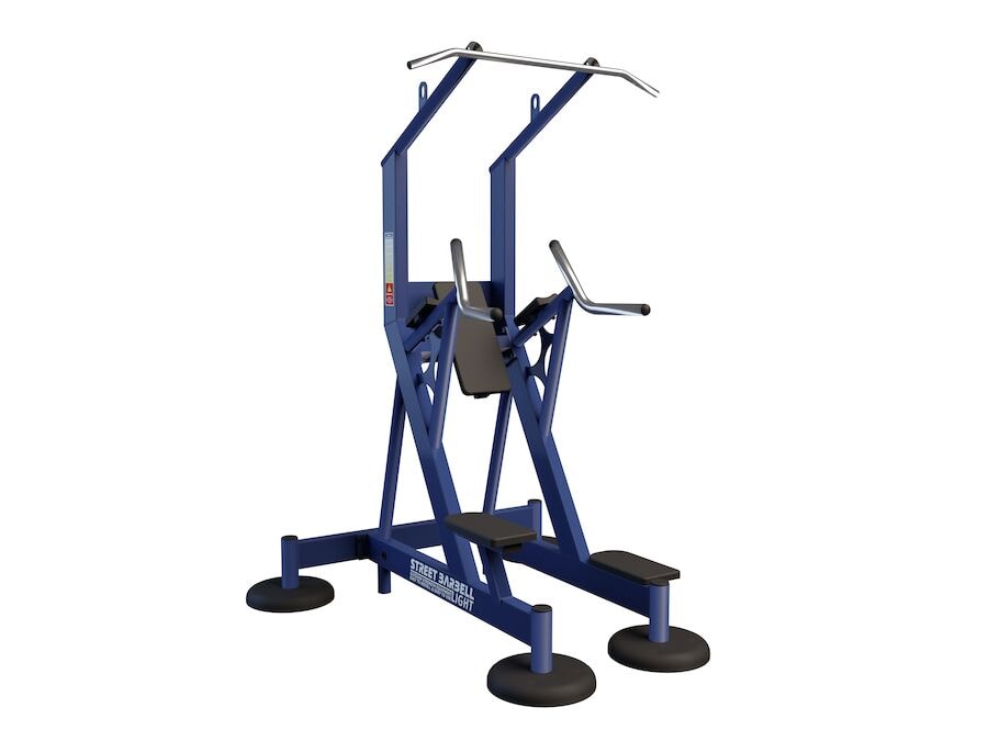 Samsett æfingastöð úr Street Barbell Light seríunni. Þessi kvið-, höku- og dýfingarstöð gerir þér kleift að þjálfa nánast alla efri vöðvahópa. Eins og aðrar Street Barbell vélar er fjölstöðin hágæða og örugg fyrir alla að æfa með. Þær eru skemmdarvarnar og þjófnaðarvarnar og þola því vel breytilegt útiloftslag. Þarfnast engra festinga og hægt er að setja hana hvar sem er á sléttu yfirborði. Veldu á milli staðlaðra lita blás, græns og gulur.