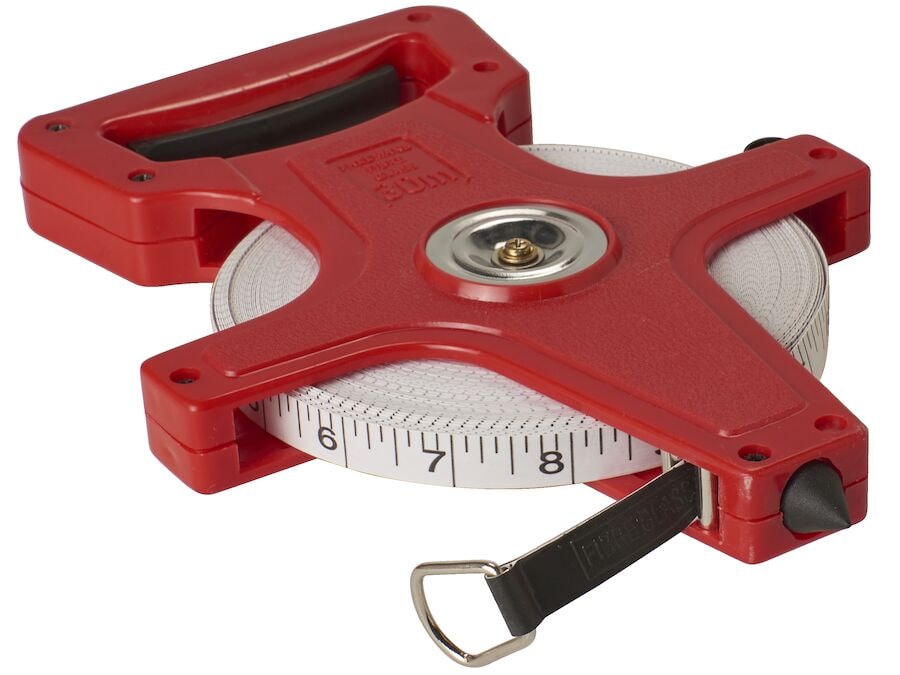 Mæliband á gaffli, 30 metrar. Mælir bæði í cm og tommum.