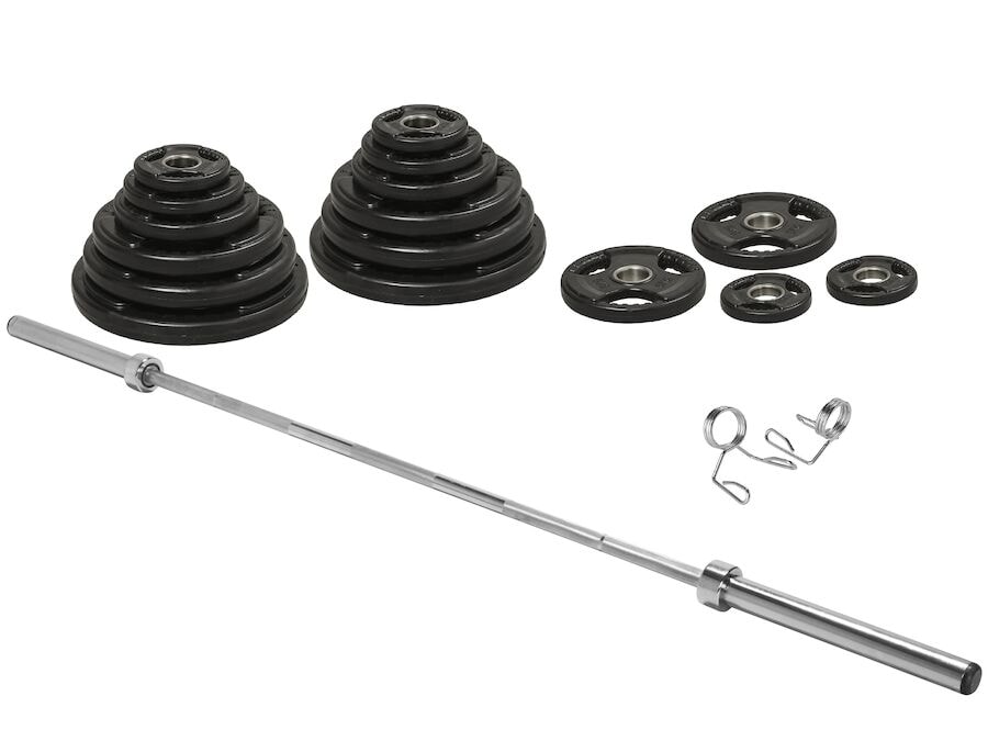 Stönglasett, 140 kg samtals. Skiptist í 16 lóðaplötur og eina stöng. Settið samanstendur af: 1 x 220 cm stöng, 20 kg 2 x Klemmulásum 4 x gúmmílóðaplötu 1,25 kg 2 x gúmmílóðaplötu 2,5 kg 4 x gúmmílóðaplötu 5 kg 2 x gúmmílóðaplötu 10 kg 2 x gúmmílóðaplötu 15 kg 2 x gúmmílóðaplötu 20 kg Gatþvermálið er 50 mm.