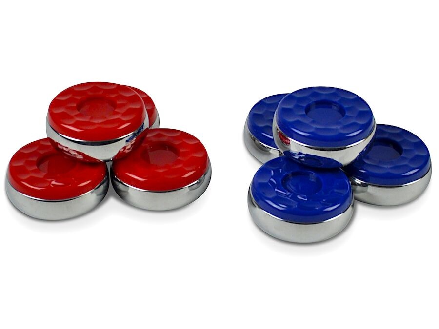 Sett með 4 rauðum og 4 bláum shuffleboard steinum. Steinarnir eru 59 mm í þvermál og vega 295 grömm hver. Hægt að nota í mótum.