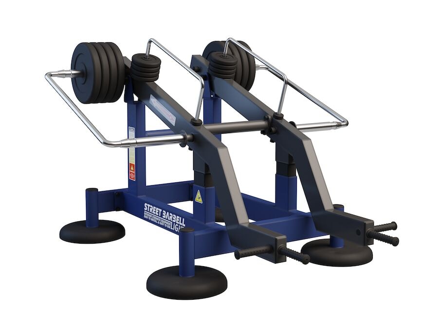 Samsett lyfting er fjölþjálfunarstöð með nokkrum þjálfunarmöguleikum sem ná yfir flesta vöðva líkamans. Hér er hægt að vinna á baki, maga, öxlum, tvíhöfða, þríhöfða, aftan í læri, rassvöðvum og fleiru á þessari einu stöð. Með lokuðu lóðakerfi er hægt að stilla viðnámið frá 30 kg upp í 250 kg. Lóðarplöturnar eru 8 x 25 kg og 8 x 2,5 kg. Street Barbell Light æfingastöðvarnar þurfa ekki neina festingu og hægt er að setja þær hvar sem er á sléttu yfirborði. Einkaleyfisvarið þyngdarkerfi sem er skemmdarvarið og þjófnaðarvarið. Hágæða og örugg þjálfun fyrir alla. Veldu á milli staðlaðra lita blás, græns og guls.