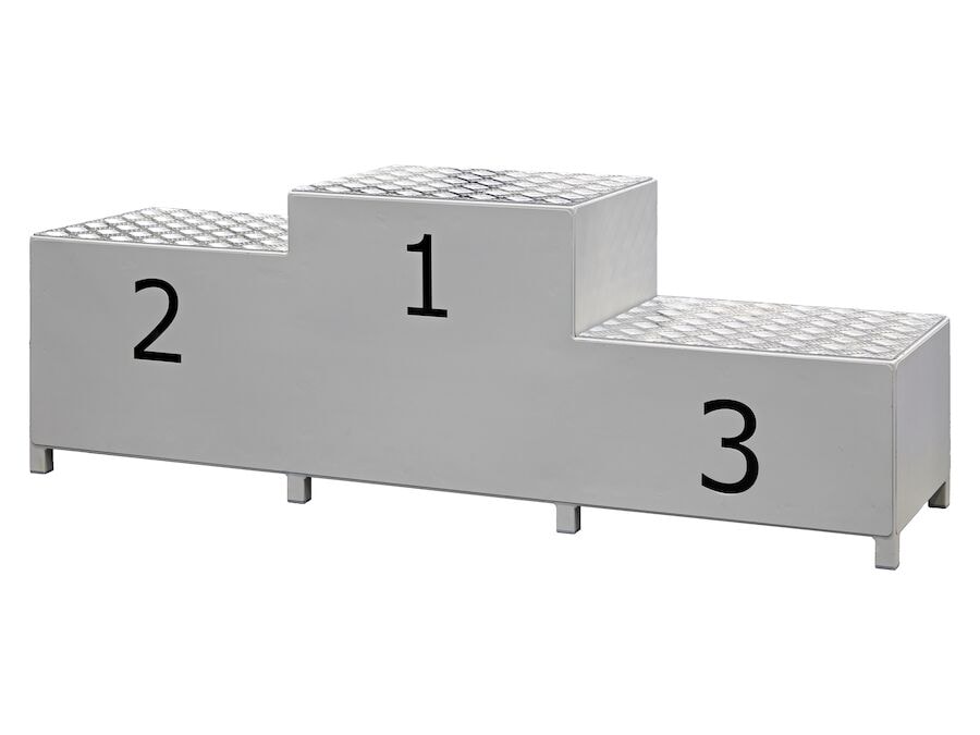 Sigurpallur úr stáli með hálkuvörn. Hver pallur hefur númeraða staðsetningu, í formi 1, 2 og 3 staða, og hæðirnar eru á bilinu 25 til 35 og 45 cm. Sterk gæði sem hægt er að nota bæði utandyra og innandyra. Einnig kallaður Verðlaunastóll, Sigurpallur, Verðlaunapallur, Sigurpallur, Sigurpallur og Sigurpallur.