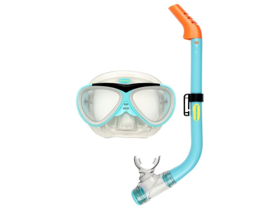 Köfunargleraugu með snorkli í juniorstærð. Gerðin passar fullkomlega við andlitið. Þessi köfunargríma tekur mið af mörgum mismunandi andlitslögunum og hylur nefið alveg. Snorklinn er með loftræstiventil svo hægt sé að anda fljótt vatninu út.