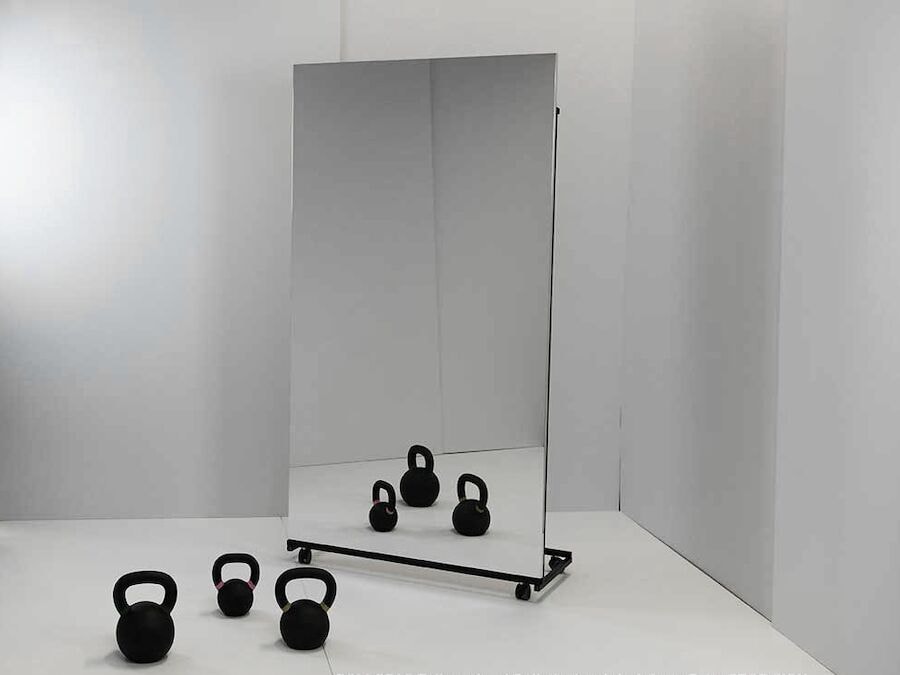 Færanlegur spegilveggur á rúllandi standi. Snjall og fjölhæfur spegill á standi með fjórum snúningshjólum, þar af tveimur með bremsum. Filmuspegillinn er tilvalinn fyrir sjúkraþjálfun, fimleika, íþróttir, skólaíþróttir og alla staði þar sem þarf að vera hægt að færa spegilinn fram og til baka eftir þörfum. Færanlegur spegilveggur, þar sem spegilflöturinn er úr pólýesterfilmu sem er strekkt út á álgrind með pólýúretan froðu sem bakhlið. Uppbyggingin veitir skýra spegilmynd án hættu á glerbrotum og vegur verulega minna en hefðbundnir speglar. Rúllandi standurinn er úr duftlakkaðri stáli og búinn fjórum snúningshjólum, þar af tvö sem hægt er að læsa. Spegillinn hentar meðal annars fyrir sjúkraþjálfun, fimleika, dans og skólaíþróttir sem og aðra staði þar sem þú vilt léttan og stöðugan spegil sem hægt er að færa um herbergið. Afhentur ósamsettur með notendavænum leiðbeiningum. Spegilfilman sjálf er fest á grindina við afhendingu. Spegilflötur: 175 × 100 cm Brunaflokkur: B1