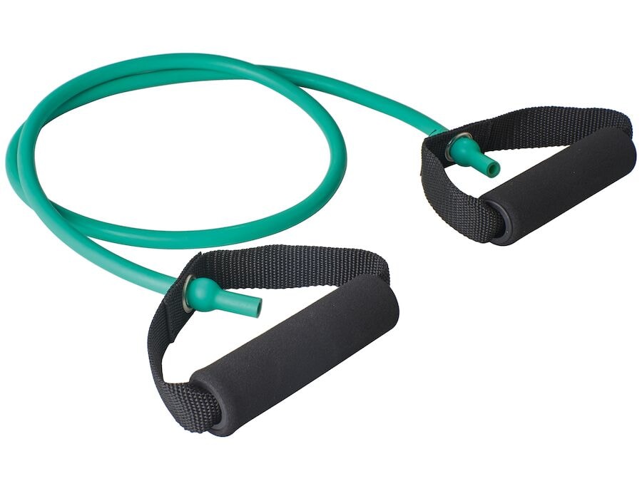 Latex-laust. Æfingateygjanlegt með handfangi fyrir styrk og endurhæfingu. Fáanlegt í mismunandi hörku og hægt að stilla það að vild.