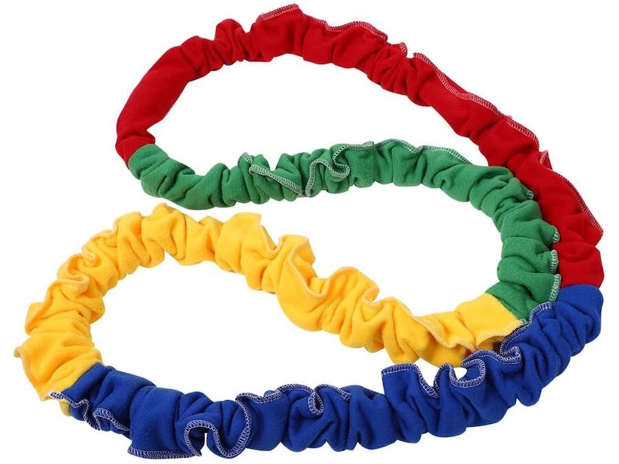Stór, skærlitaður teygjuband fyrir samvinnuæfingar og leiki. Börn finna fljótt út nokkra leiki með teygjunni, sem er sterk og krefst þess að nokkrir vinni saman að teygjunni. Þau geta búið til hring og séð síðan hversu mörg börn eru pláss fyrir, þau geta hoppað yfir og undir eða leyst hnúta án þess að sleppa teygjunni. Leggstu á bakið og notaðu aðeins fæturna til að snúa teygjunni, sem verður að halda útréttri á sama tíma til að detta ekki niður. Það er hafsjór af leikjum sem hægt er að spila með þessari samvinnuteygju. Inni í mjúku og þægilegu efni í glaðlegum litum er sterkt teygjuband sem þolir mikið álag. Samvinnubandið, eins og það er einnig kallað, er samtals um það bil 360 cm langt og um það bil 115 cm í þvermál. Þykktin er 3 cm.