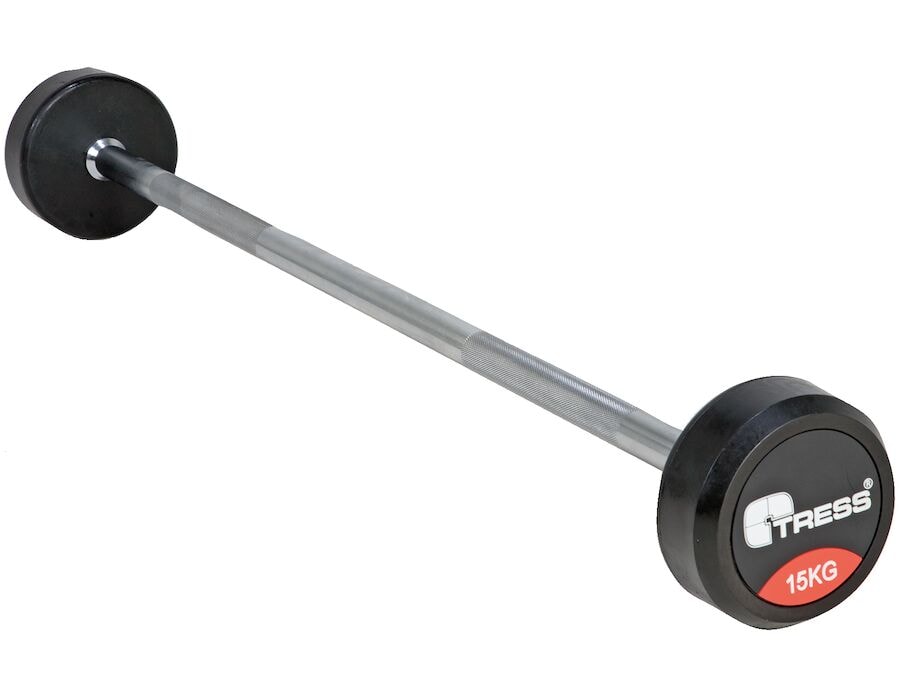 Þessi fasta lóðstöng, 15 kg, passar fullkomlega í líkamsræktarþjálfun. Kosturinn við fasta þyngdina er að hún er auðveld í notkun. Annar kostur gæti verið að lóðaplötur og lóðastöngir liggja ekki og týnast eða farast úr skorðum. Fyrsta flokks gerð með rifflaðri handfangi fyrir betra grip. Þessi tegund af lóðstöng með fastri þyngd er fáanleg í mismunandi þyngdum.