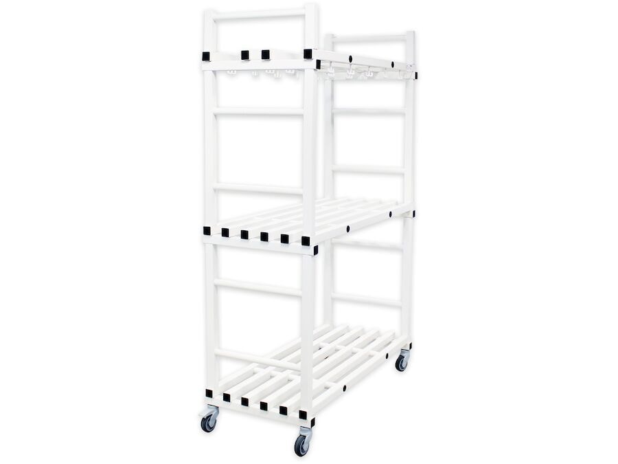 Hagnýt geymsluvagn með flutningshjólum. Vagninn er með 3 hillum, þar sem gott pláss er fyrir fylgihluti sundlaugarinnar. Á hverri hillu er til dæmis pláss fyrir 3 geymslukassa, sem gerir þér kleift að geyma kerfið. (Kassana verður að panta sérstaklega) Vagninn er með krókum fyrir sundbelti og þess háttar. Smíðaður úr gegnheilum PVC-listum í ferkantaðri prófíl, sem er ónæmur fyrir bakteríum, raka og klór.