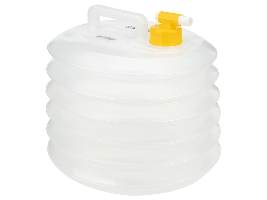 Samanbrjótanleg vatnsflaska með krana og burðarhandfangi. Tekur allt að 15 lítra af vökva og tekur lágmarks pláss þegar hún er tóm. Hentar fyrir afþreyingu og viðburði innandyra og utandyra. Þessi vatnsflaska rúmar um það bil 15 lítra og er úr BPA-fríu pólýetýleni. Ferkantað lögun og harmonikkulík uppbygging gerir hana auðvelda í samanbrjótanlegri notkun, þannig að hún tekur lágmarks pláss við flutning og geymslu. Vatnsflaskan er búin skrúftappa með innbyggðum krana sem gerir það auðvelt að tæma vatnið. Hægt er að fjarlægja kranann ef þarf að fylla flöskuna fljótt. Styrkt burðarhandfang tryggir góða stöðugleika þegar vatnsflaskan er full. Gagnsætt plast gerir það mögulegt að sjá vatnsborðið og kannan hentar bæði fyrir drykkjarvatn og aðra vökva. Notuð fyrir íþróttaviðburði, útivist, viðburði og staði þar sem auðvelt er að nálgast vatn.