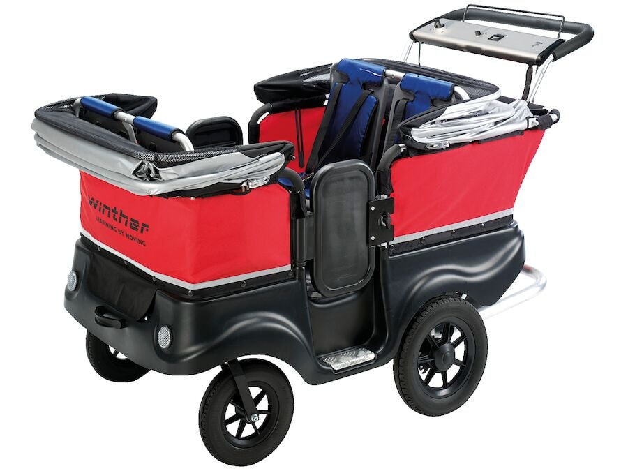 Hættu að setja óþarfa álag á líkamann! Rafknúna barnarútan Turtle er rafknúin barnarúta sem getur ekið allt að 6 km á klukkustund. Sem gerir það mun auðveldara fyrir bílstjórann að flytja börnin. Rafhlaðan er fullhlaðin á aðeins 6-8 klukkustundum, þannig að hún er tilbúin fyrir skoðunarferð næsta dags. Barnarútan er með tjaldhimni. Álgrind með 125 kg burðargetu. Pláss fyrir farangur í lokuðu hólfi. Fest með gataheldum dekkjum sem, af reynslu, eru jafn auðveld í notkun og loftdekk. Önnur sterk dönsk Winther vara.